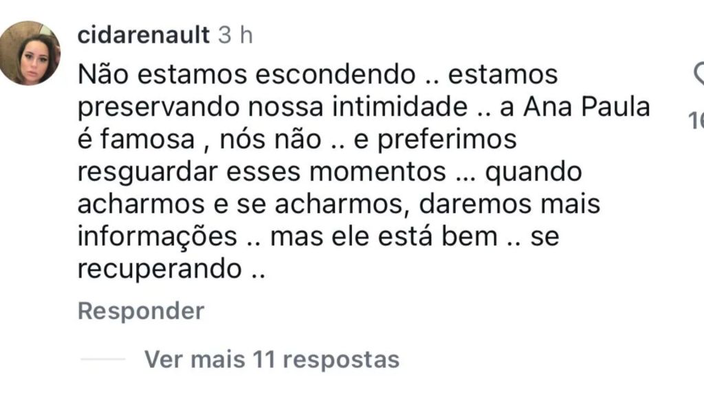 Por meio do Instagram, Cida respondeu a algumas páginas que davam conta de uma piora no estado de saúde do idoso. “Não estamos escondendo, estamos preservando nossa intimidade. A Ana Paula é famosa, nós não… E preferimos resguardar esses momentos. Quando acharmos, e se acharmos, daremos mais informações. Mas ele está bem, se recuperando“, escreveu.
